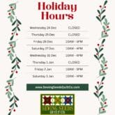 We will be CLOSED Christmas Eve and Christmas Day Open New Year’s Day 10AM-4PM CLOSED New Year’s Day